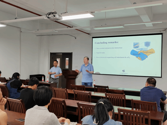 首先,姜伟教授介绍了Donghong Yu(于冬宏)副教授的科研和工作经历,并对于教授的到来表示热烈欢迎。随后,于教授先详细介绍了奥尔堡大学的基本情况以及研究生招生情况。随后于教授做了以““Tough SiO2-Polymer Hybrids”为题的学术报告。报告围绕韧性二氧化硅杂化材料的制备展开,从二氧化硅纳米粒子的表面改性和聚合出发,通过二氧化硅的溶胶-凝胶反应的控制,调控聚合物的链结构和二氧化硅的凝胶过程,实现了韧性的二氧化硅杂化材料的构筑。于教授深入浅出地讲解了如何从材料的应用出发,对高杂化材料结构的合理设计,实现材料性能的调控。报告为员工从高分子合成角度出发,理解高聚合物的结构性能关系给出了很好的示范。报告结束后与于教授与参会的师生进行了热烈的交流,并认真详细地解答了师生们的问题。最后,参会师生对陈教授表示了诚挚感谢。